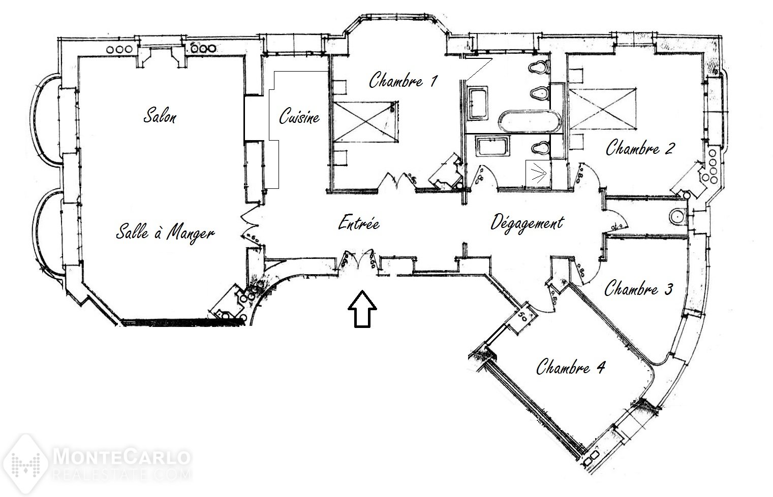 Entrée, 1 double salon salle à manger en façade avec balcons, 1 cuisine aménagée, 1 salle de bains complète, 1 salle de douche complète, 4 chambres dont une avec bow-window, 1 toilette séparé.